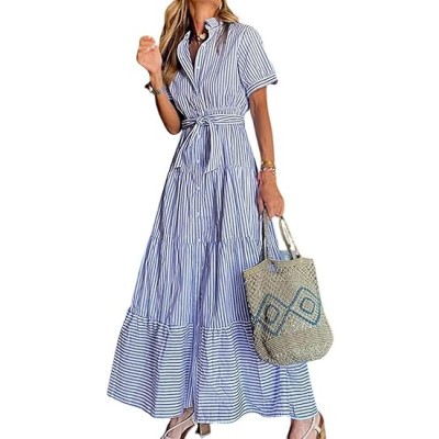 Women's casual short sleeved buckle waistband, ruffle edge striped extra long shirt dress